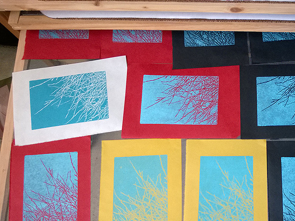 Traditional printmaking techniques on colored paper